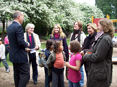 Herr Röhrs vom Hauptsponsor, der Gerda-Tietjen-Stiftung, im Gespräch mit Frau Wolle und den Lehrerinnen Frau Malsfey, Frau Reiche, Frau Timm und Frau Ziener.
