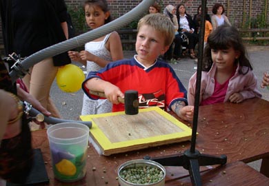 An der Erbsenbahn der Klasse 5b konnte man seine Reaktionsschnelligkeit beweisen. Leicht war es nicht, die Erbse mit dem großen Hammer zu treffen.